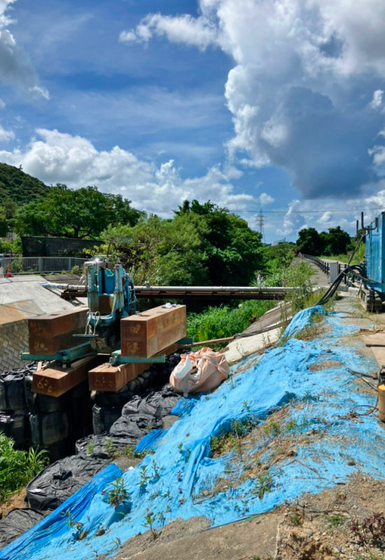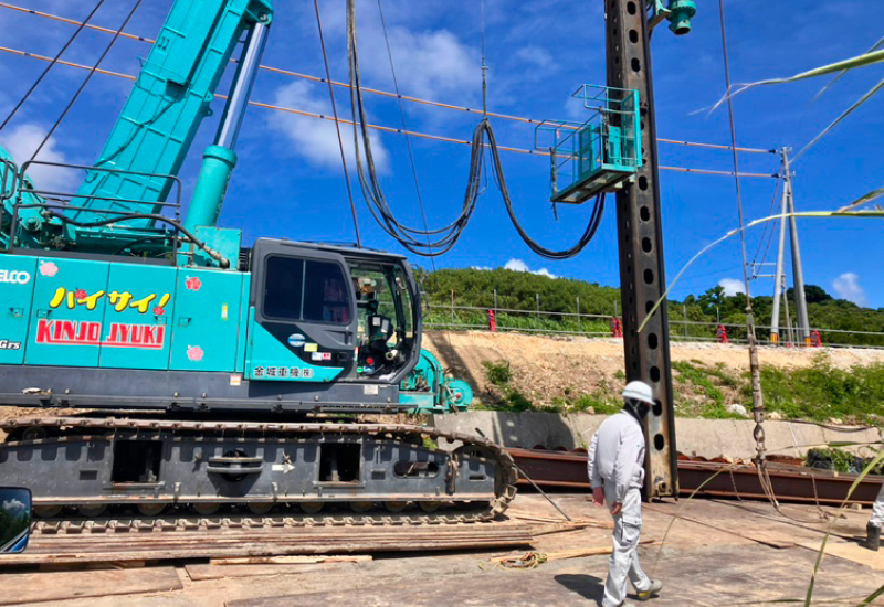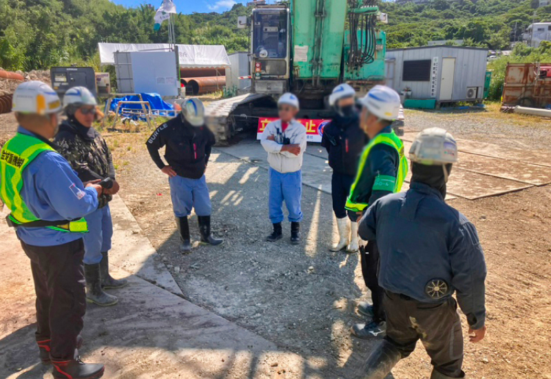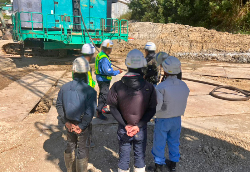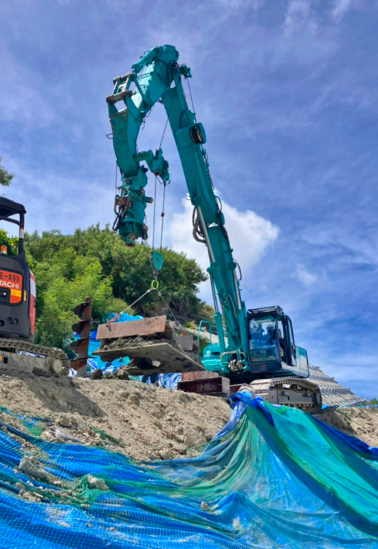 - 現場が狭いかつ勾配が厳しい為、リーダレスの作業半径を伸ばさないように指示した。